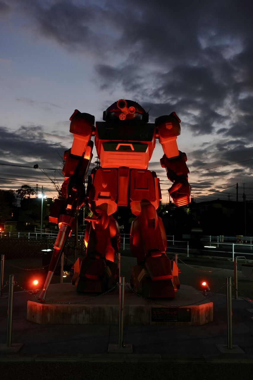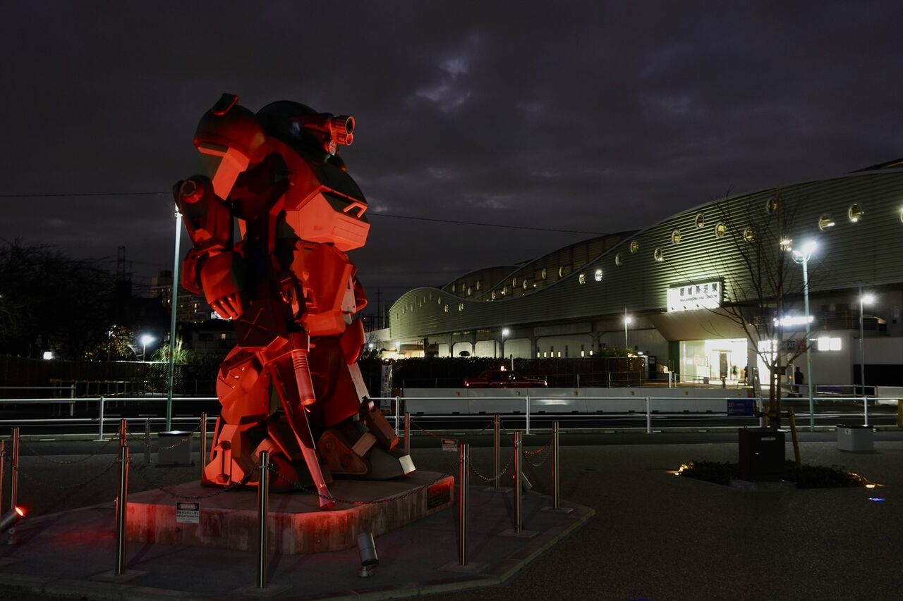JR稲城長沼駅前のスコープドッグ像が12/1〜12/27予定まで期間限定で赤くライトアップしています!かっこいい! ©︎サンライズ pic.twitter.com/uiMfRQBsRE